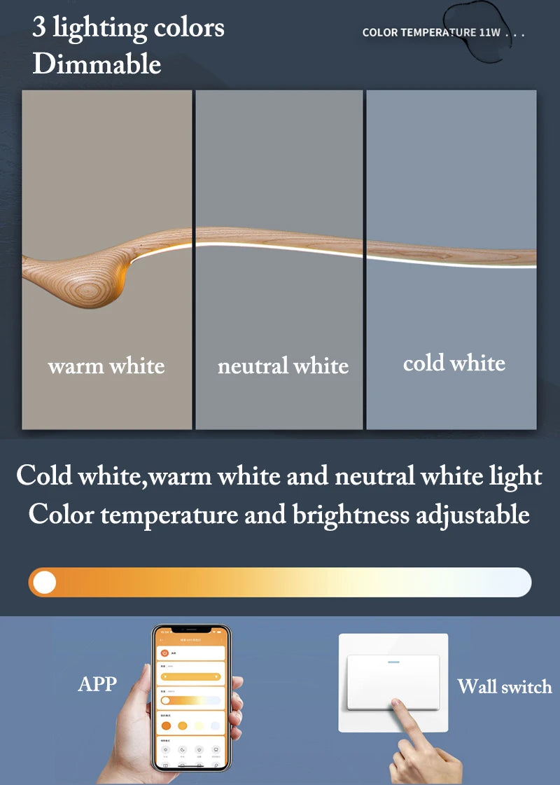Finish options tune the mood. The light ash glows warmly and harmonizes with natural interiors; the dark stain adds richness and a quiet luxe; the matte black highlights the grain and delivers modern drama. Color temperature shifts smoothly from warm to neutral to cool white, and brightness is dimmable via app or wall switch, letting the piece move from ambient glow to task lighting on command. An adjustable, ash‑wood biomorphic pendant with integrated dimmable LED via the remote and diffuser, offered in light, dark, and black finishes.